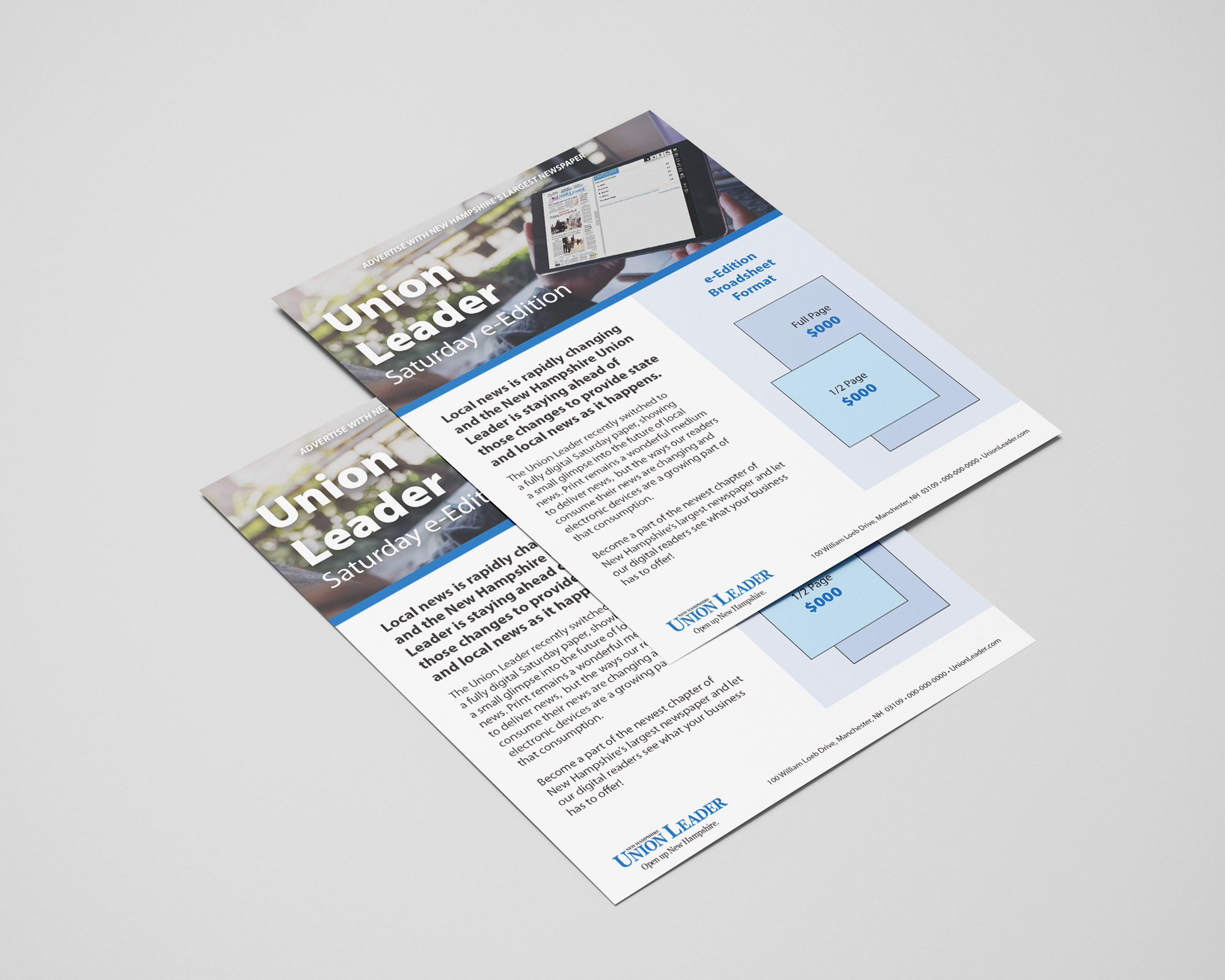 As part of my role in marketing at the Union Leader, I am responsible for creating all of the sell sheets/one sheets that our sales representatives use to sell our various ad opportunities, including special sections, seasonal offers, or basic ad packages. They needed a unified look for their sell sheets to both reflect the company’s brand and appear more professional to potential clients.